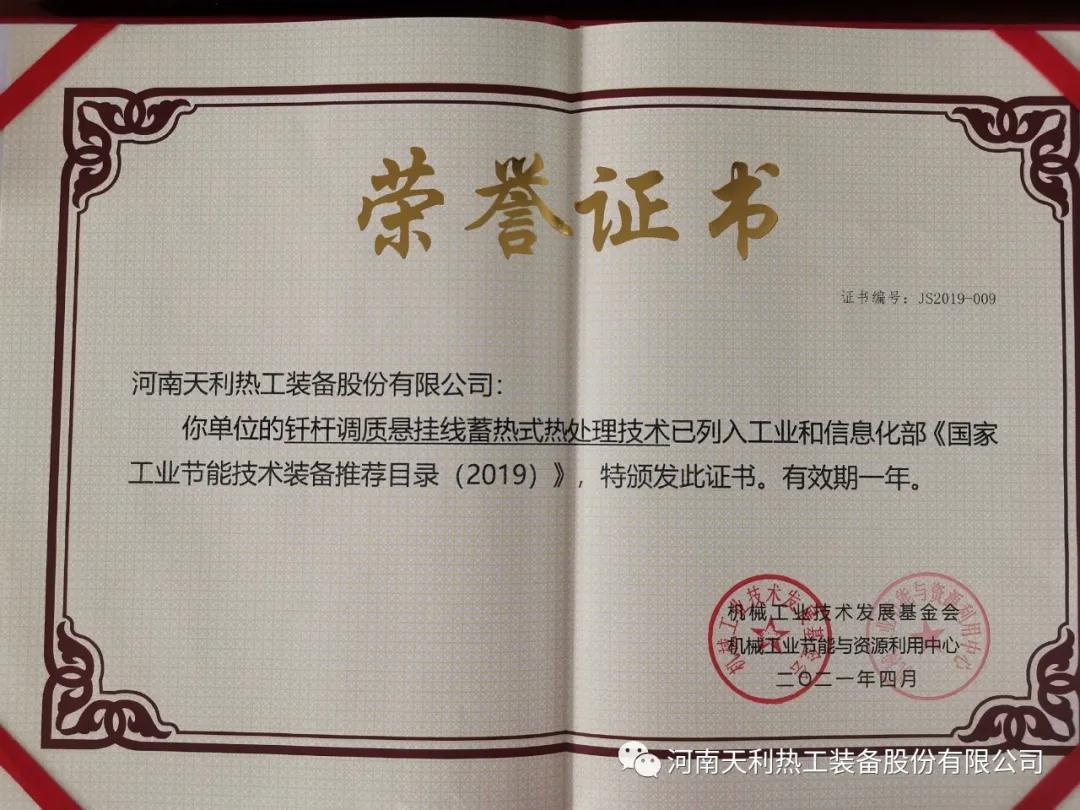 會議發布了2020年《國家工業節能技術裝備推薦目錄》及《“能效之星”產品目錄》入圍企業名單,并為2019、2020年入圍企業發放能效標識及相關證書。天利熱工兩項技術被列入推薦目錄,其中釬桿調質懸掛線蓄熱式熱處理技術被列入《國家工業節能技術裝備推薦目錄(2019)》,超大型4段蓄熱式高速燃燒技術被列入《國家工業節能技術裝備推薦目錄(2020)》。